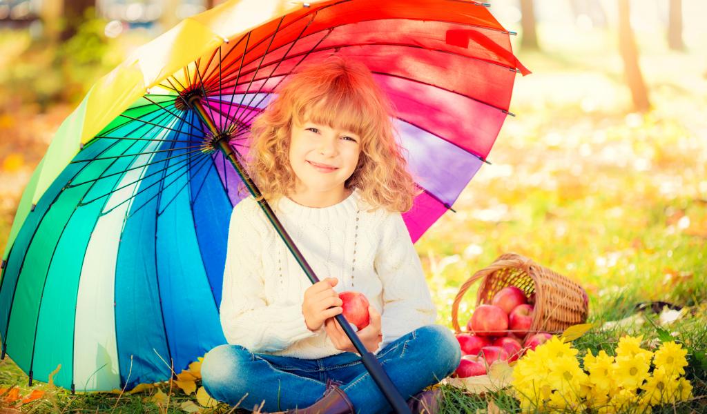 Обои Улыбающаяся девочка под сидит под разноцветным зонтом
