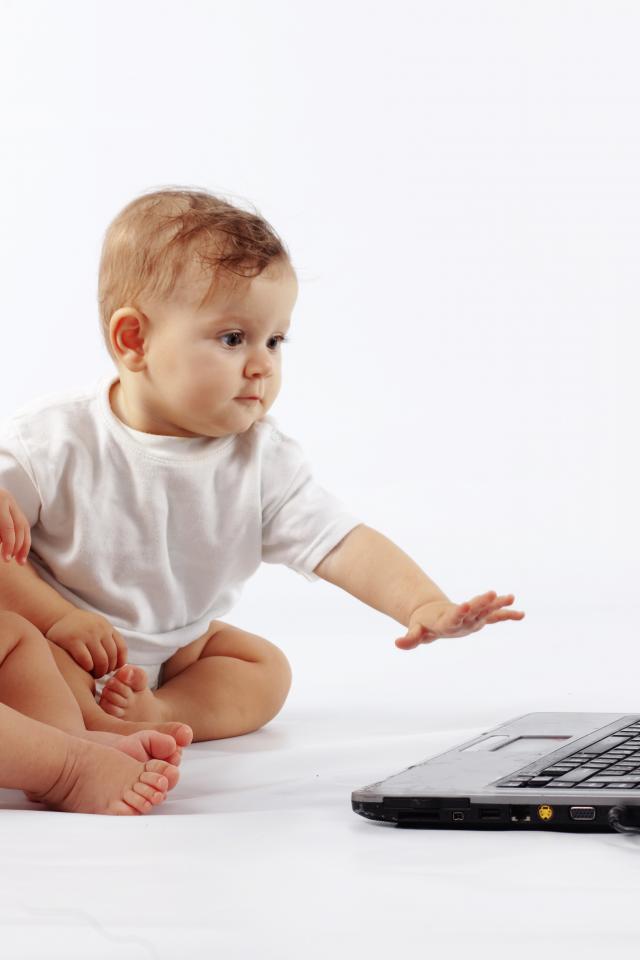 Обои Два младенца перед ноутбуком на белом фоне