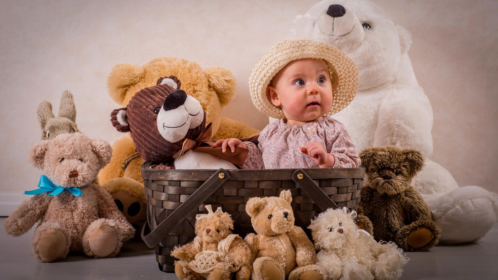 Обои Забавный грудной ребенок в корзине с мягкими игрушками