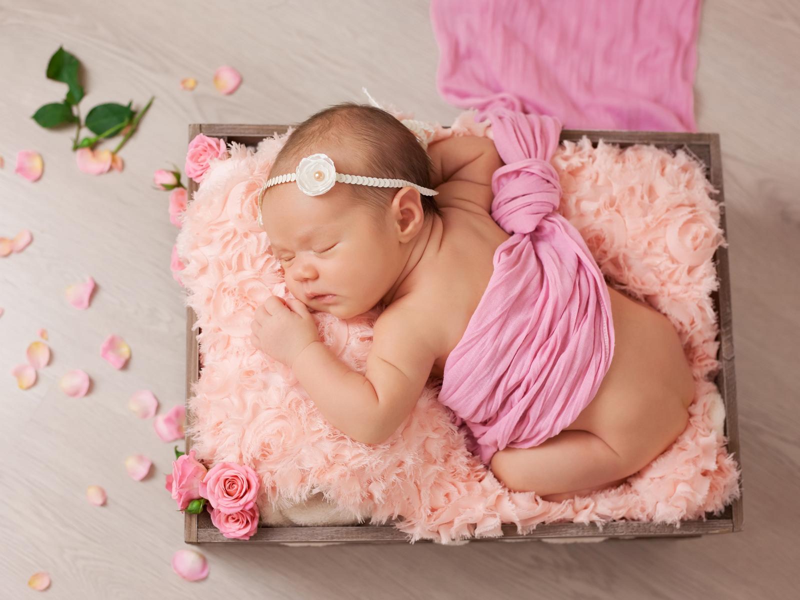 Обои Спящий младенец с розовыми лепестками роз