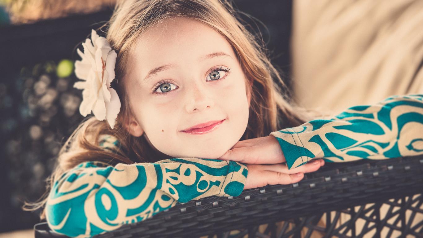 Обои Улыбающаяся зеленоглазая девочка с белым цветком в волосах