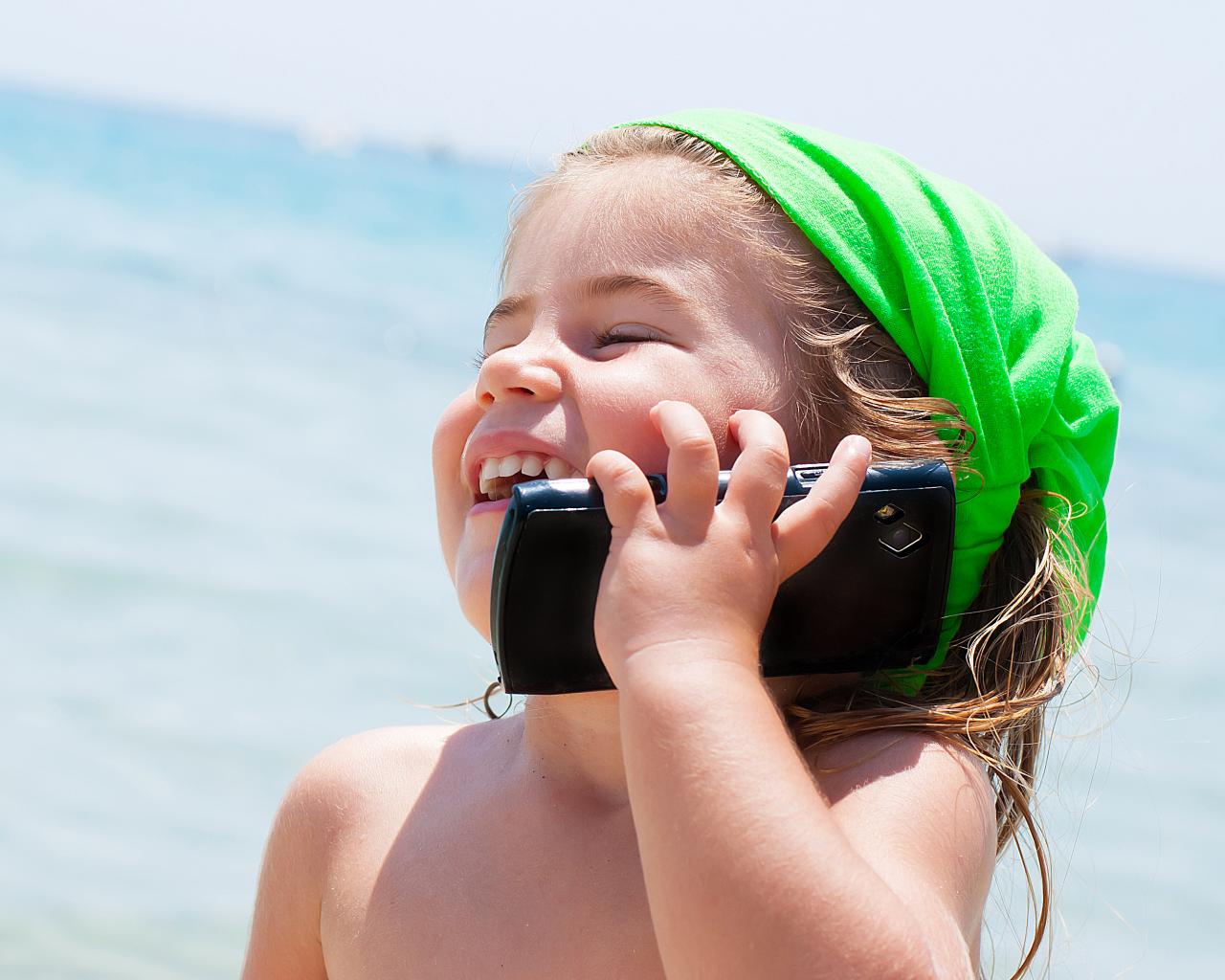 Обои Улыбающаяся девочка в зеленом платке разговаривает по телефону