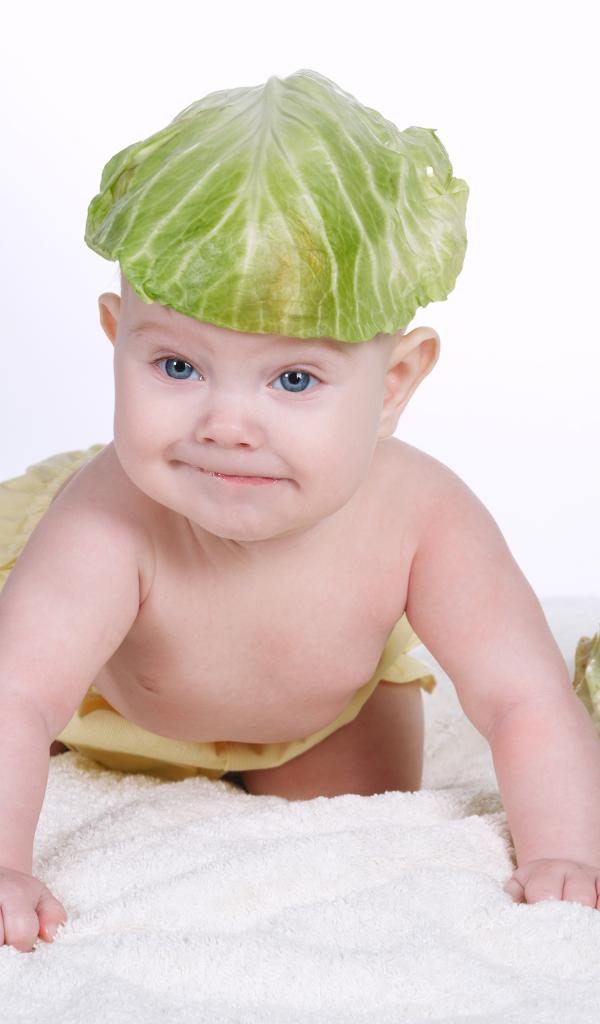 Обои Маленький грудной ребенок с капустным листом на голове