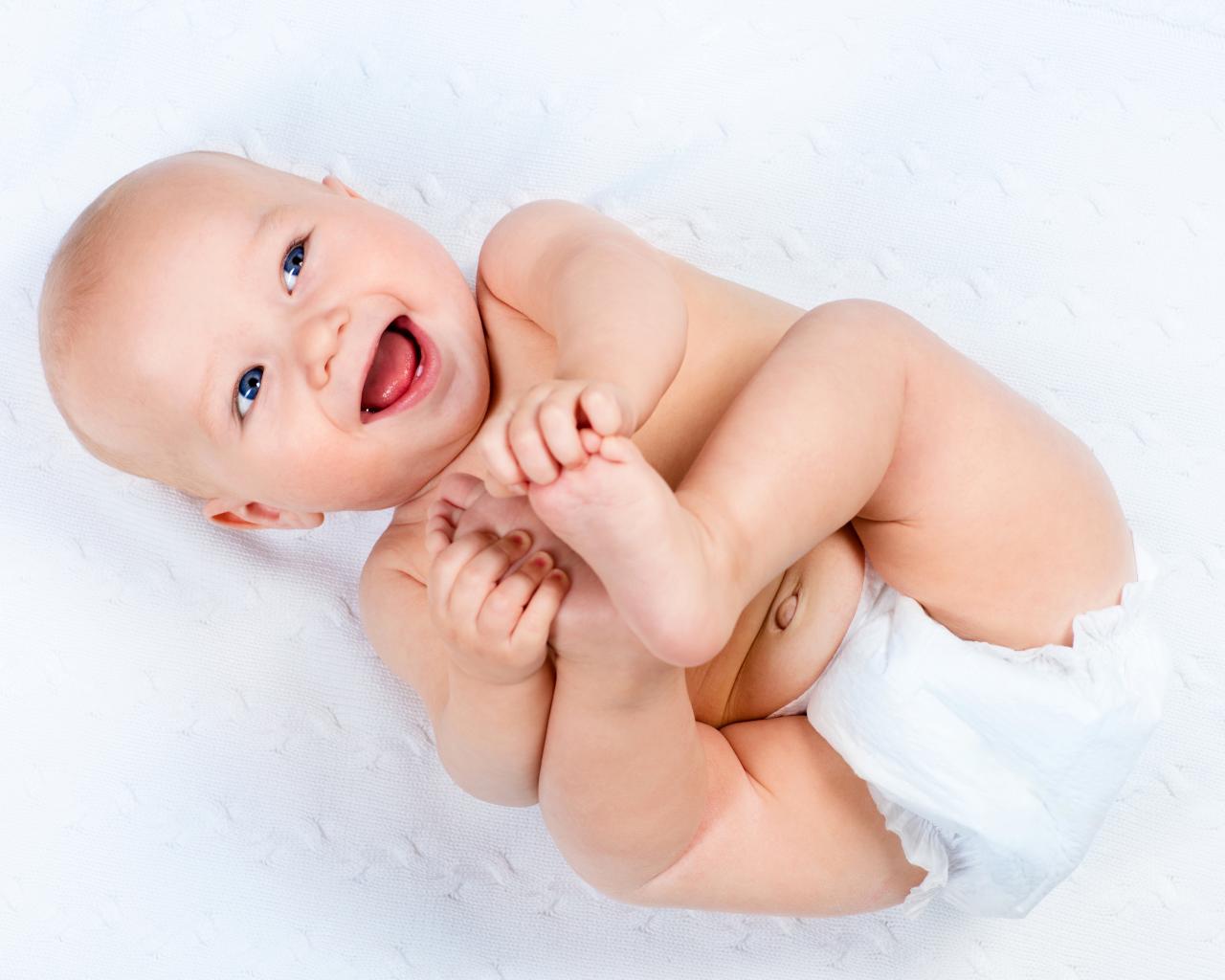 Обои Маленький улыбающийся грудной ребенок держит руками ноги