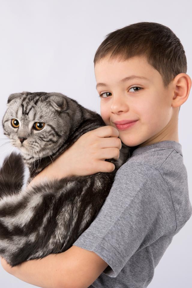 Обои Маленький мальчик с большим котом на сером фоне