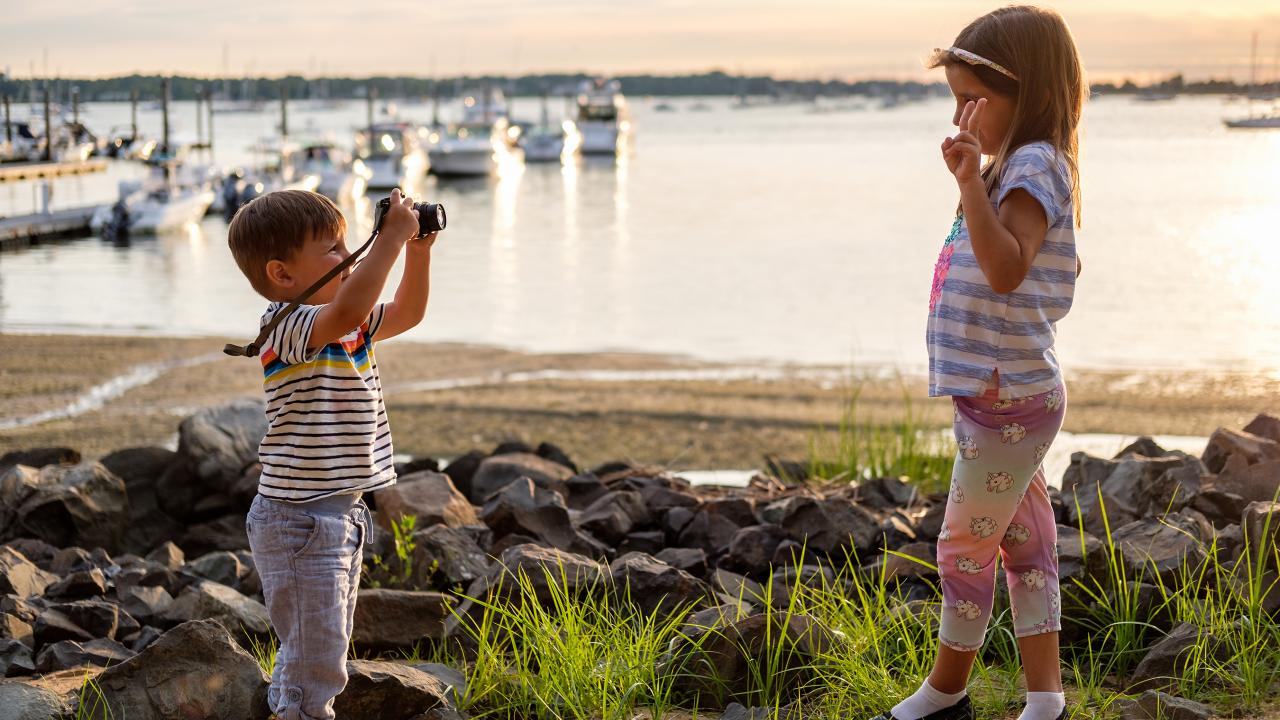 Обои Маленький мальчик фотографирует девочку на берегу