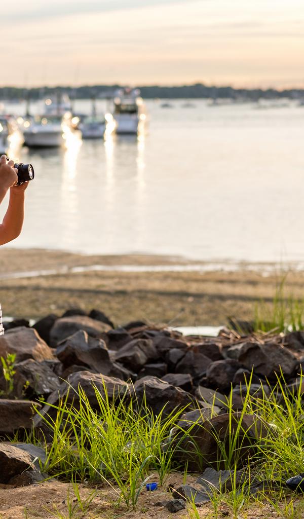 Обои Маленький мальчик фотографирует девочку на берегу