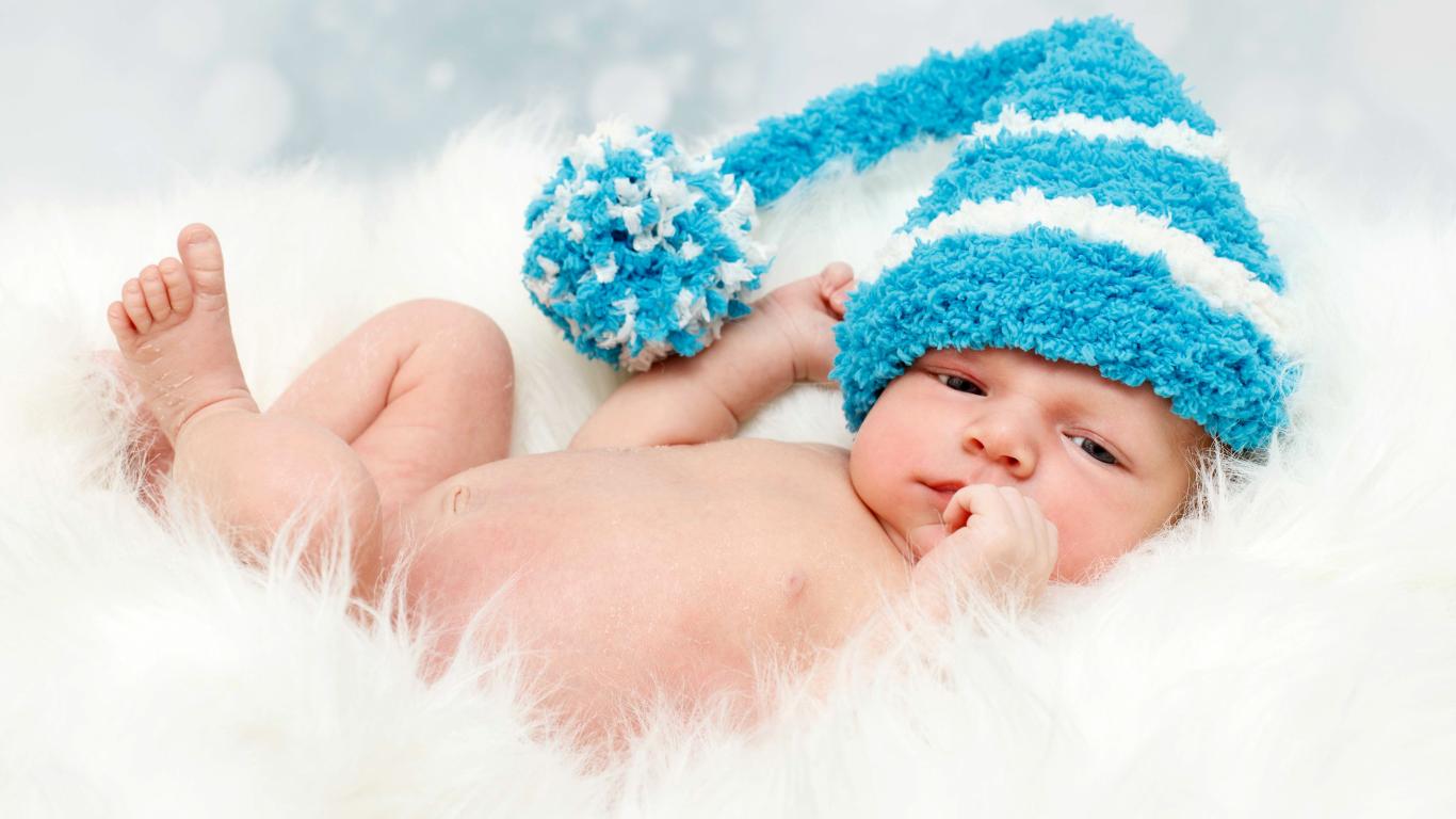 Обои Грудной ребенок в голубой шапке с бубоном на голове