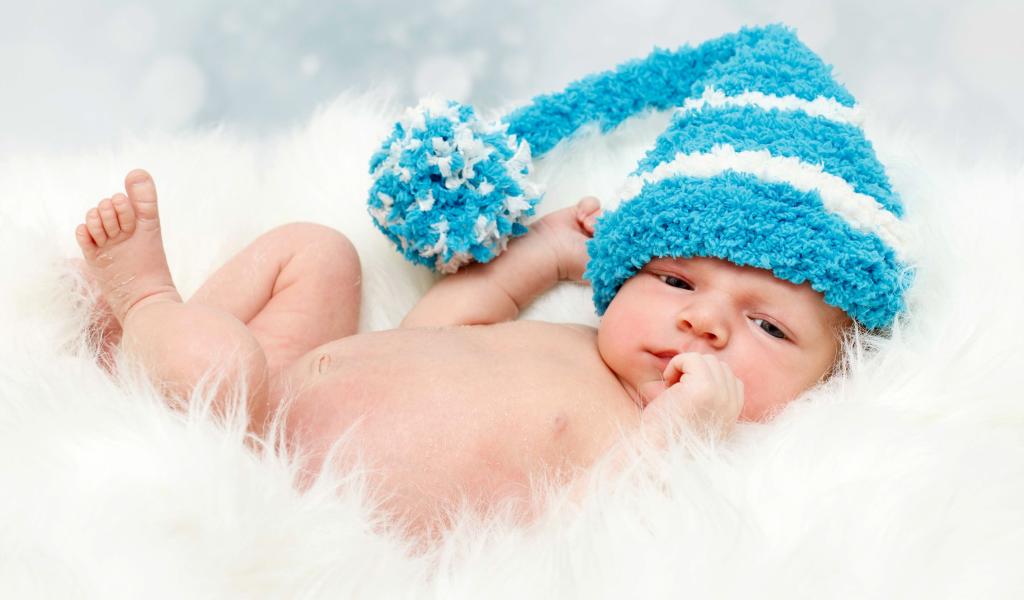 Обои Грудной ребенок в голубой шапке с бубоном на голове