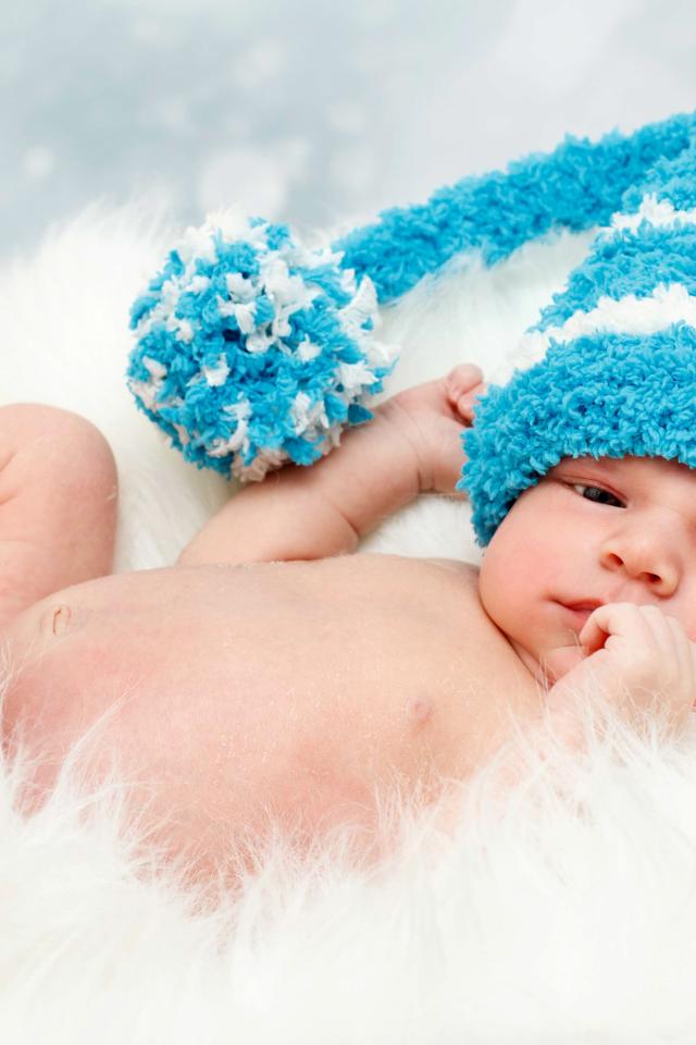 Обои Грудной ребенок в голубой шапке с бубоном на голове