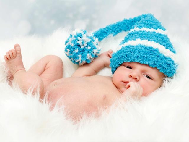 Обои Грудной ребенок в голубой шапке с бубоном на голове