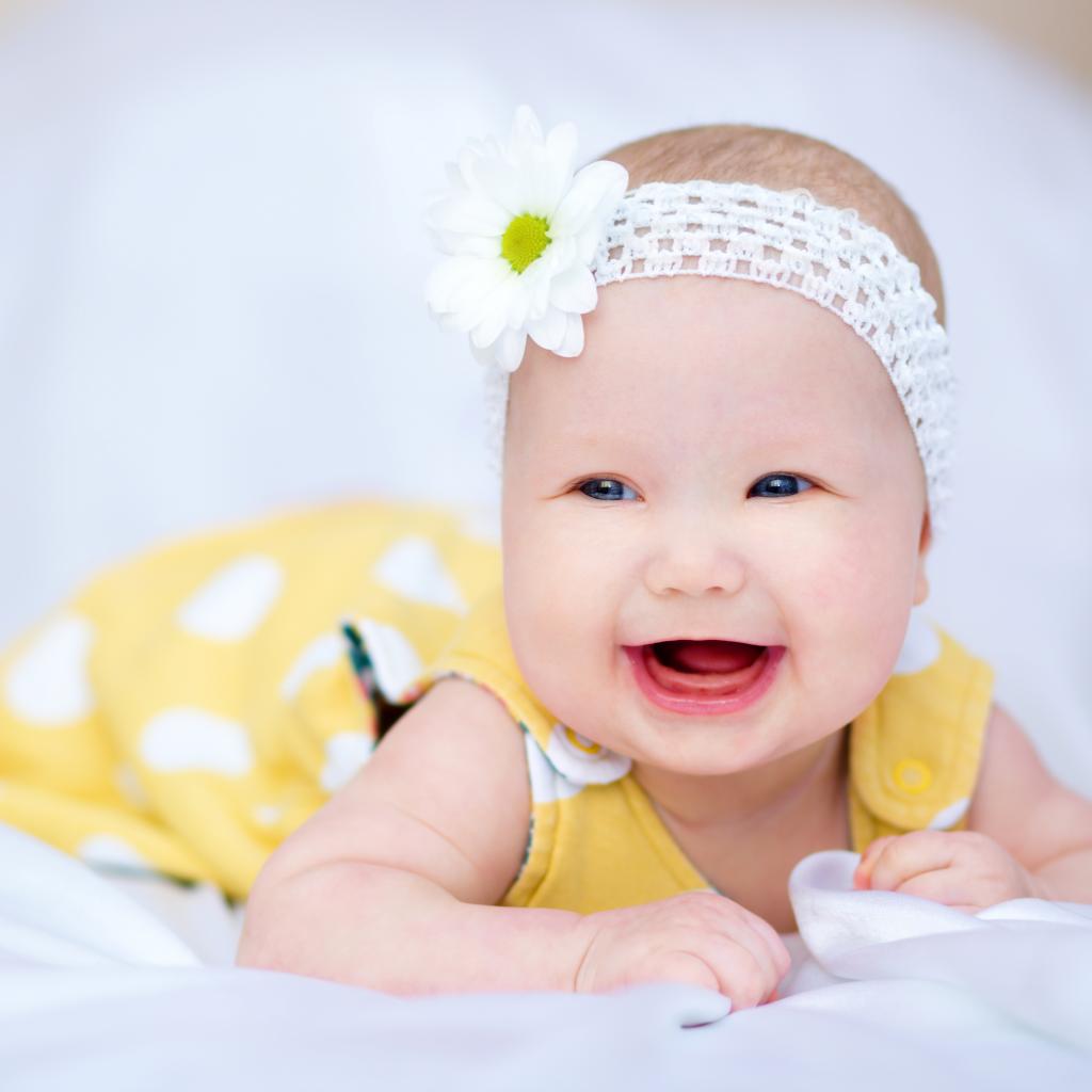 Обои Улыбающаяся маленькая девочка в повязке с белым цветком на голове