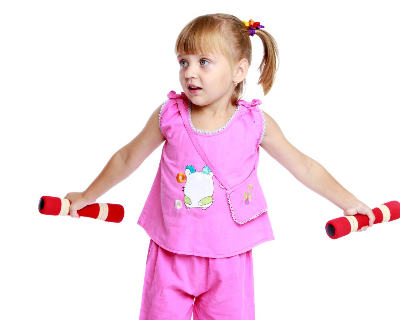 » Обои Маленькая девочка в розовом костюме с гантелями в руках