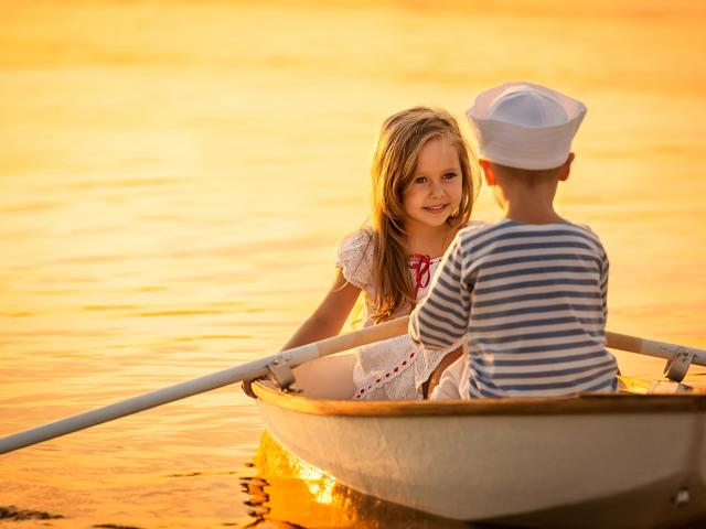 Обои Маленькие мальчик и девочка плывут в лодке на закате солнца
