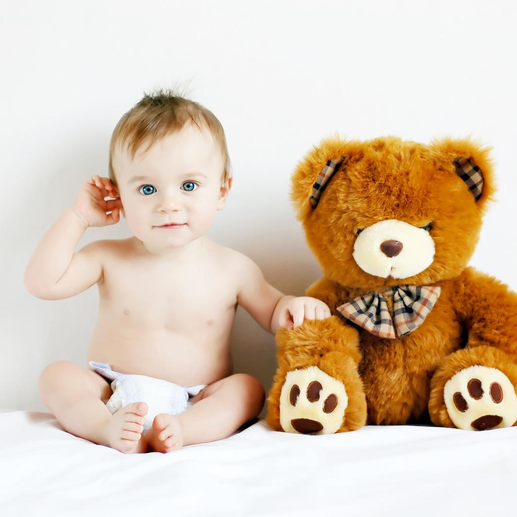 Обои Маленький голубоглазый ребенок с большим плюшевым медведем