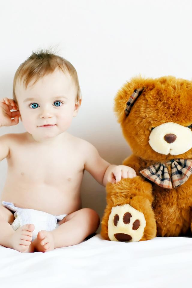 Обои Маленький голубоглазый ребенок с большим плюшевым медведем