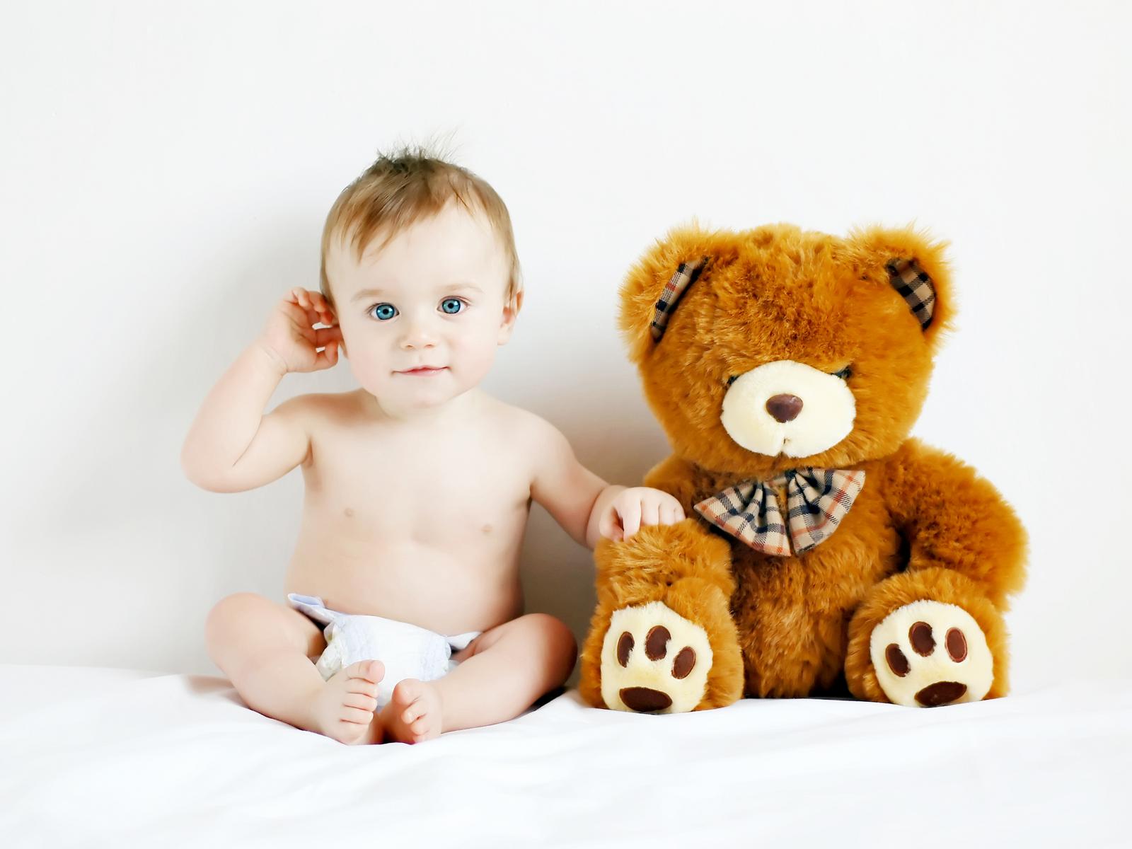 Обои Маленький голубоглазый ребенок с большим плюшевым медведем