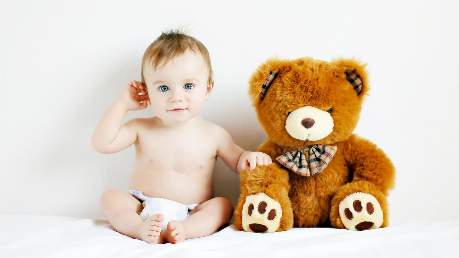 Обои Маленький голубоглазый ребенок с большим плюшевым медведем