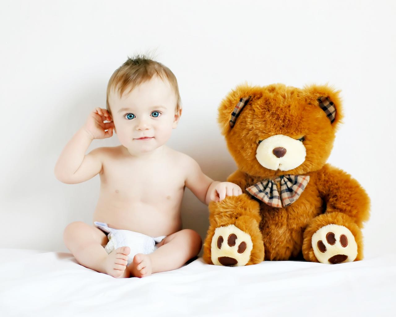 Обои Маленький голубоглазый ребенок с большим плюшевым медведем