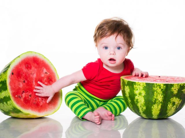 Обои Маленький мальчик с половинами арбуза на белом фоне