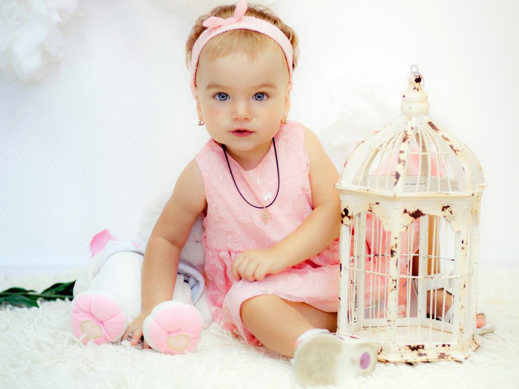 Обои Красивая маленькая девочка в розовом платье с клеткой