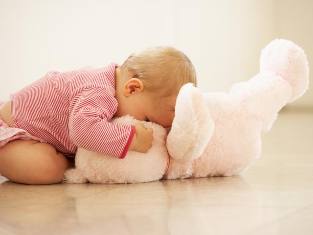 Обои Маленький ребенок играет с розовым плюшевым мишкой