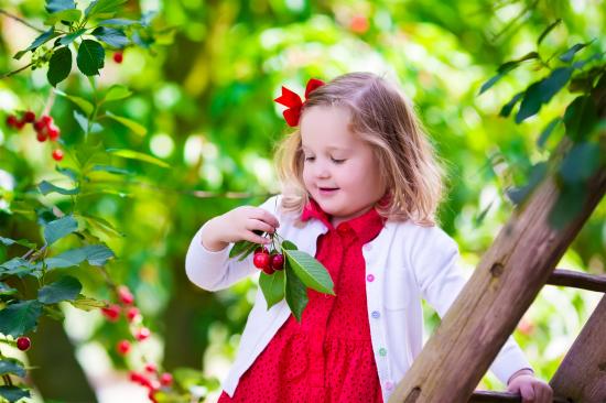 Обои Маленькая улыбающаяся девочка рвет вишни с дерева