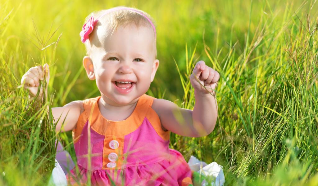 Обои Маленькая улыбающаяся девочка сидит в зеленой траве