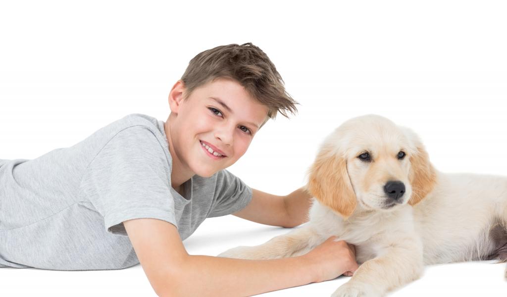 Обои Маленький мальчик с щенком ретривера на белом фоне