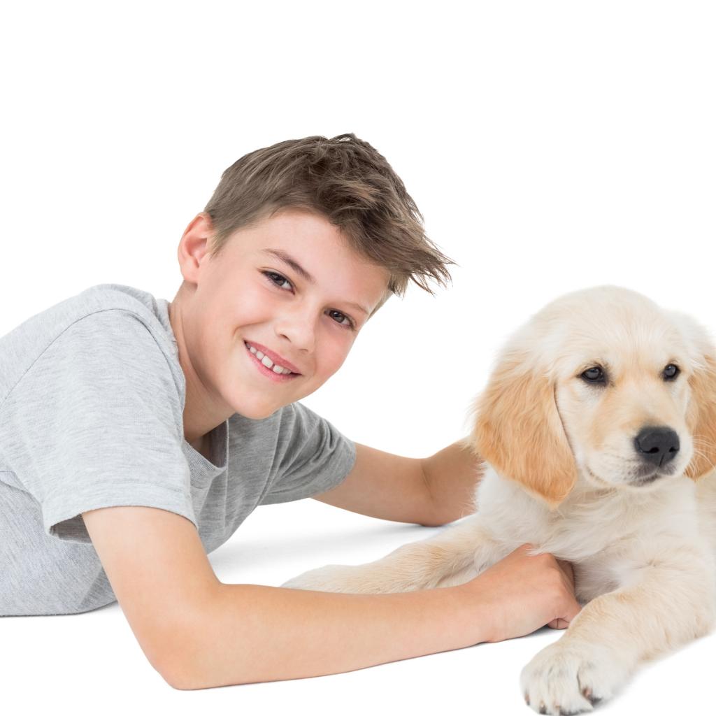 Обои Маленький мальчик с щенком ретривера на белом фоне