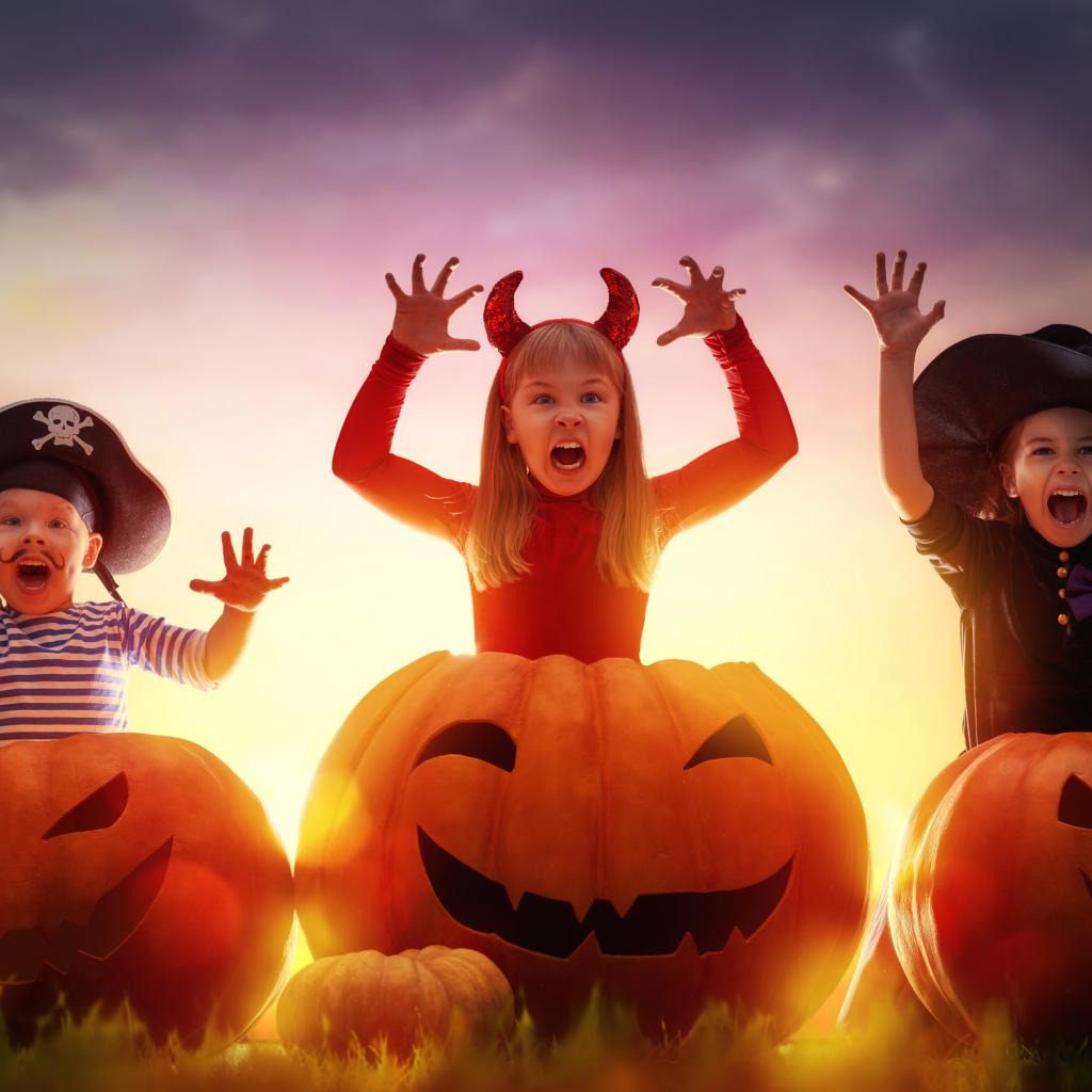 Обои Маленькие дети в костюмах на Хэллоуин с большими тыквами