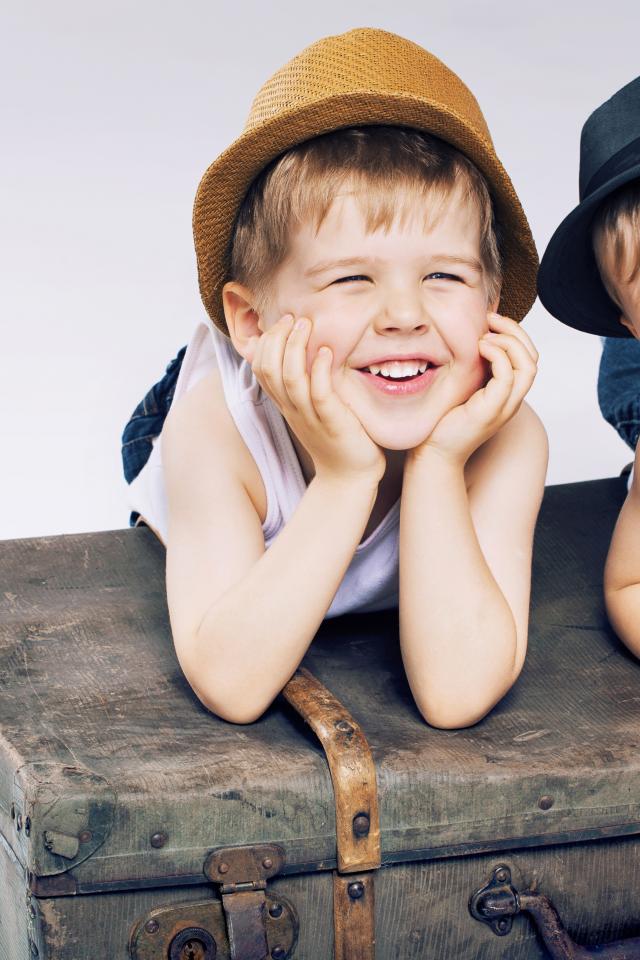 Обои Два маленьких улыбающихся мальчика лежат на старом чемодане