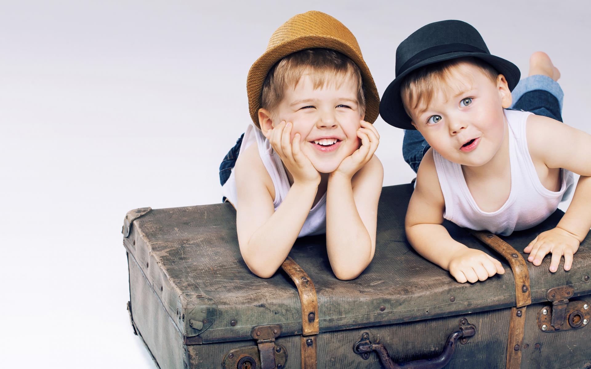 Обои Два маленьких улыбающихся мальчика лежат на старом чемодане