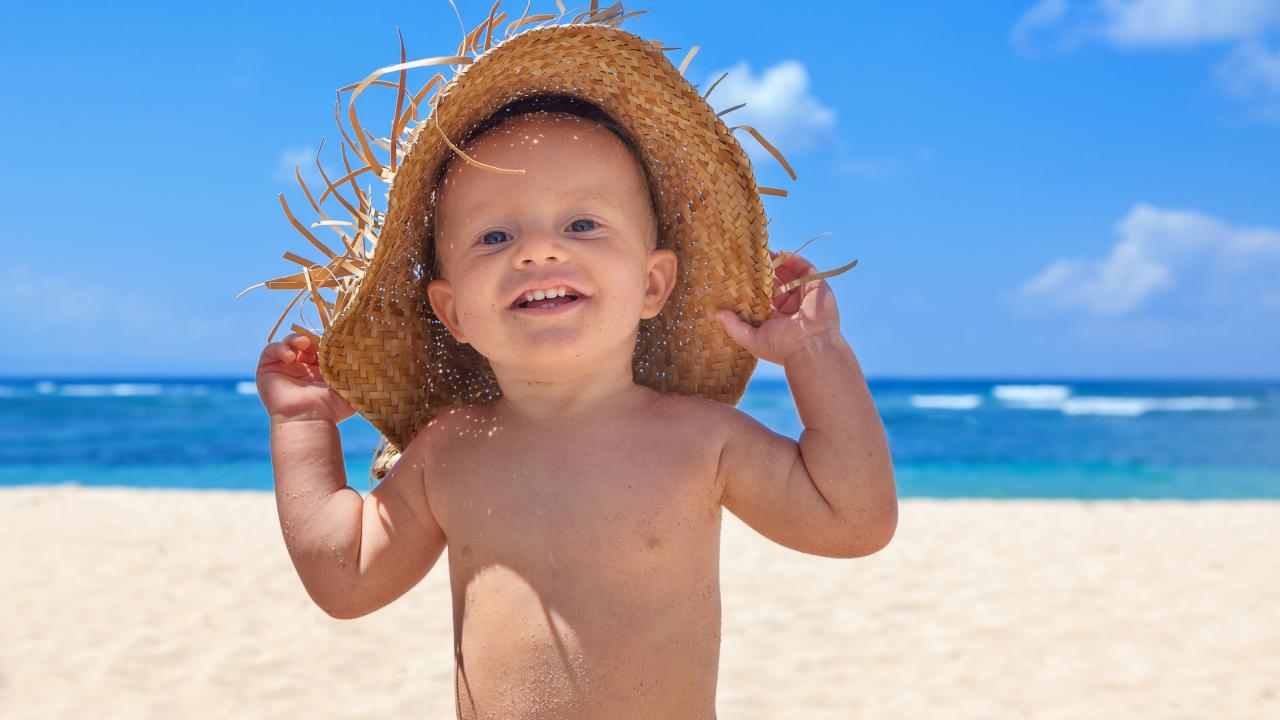 Обои Маленький улыбающийся мальчик в соломенной шляпе на пляже