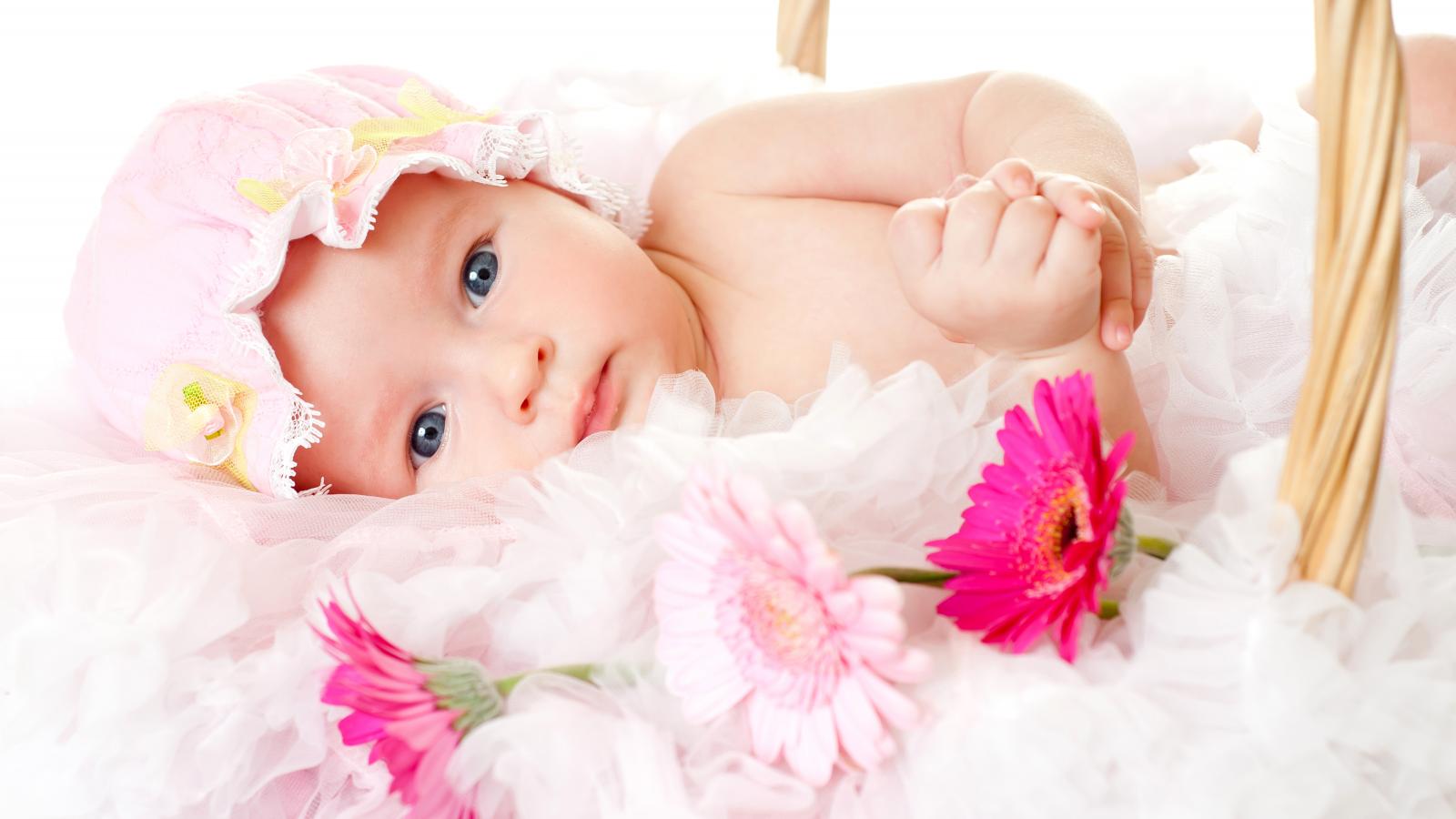 Обои Милая девочка с шапке с тремя цветками герберы