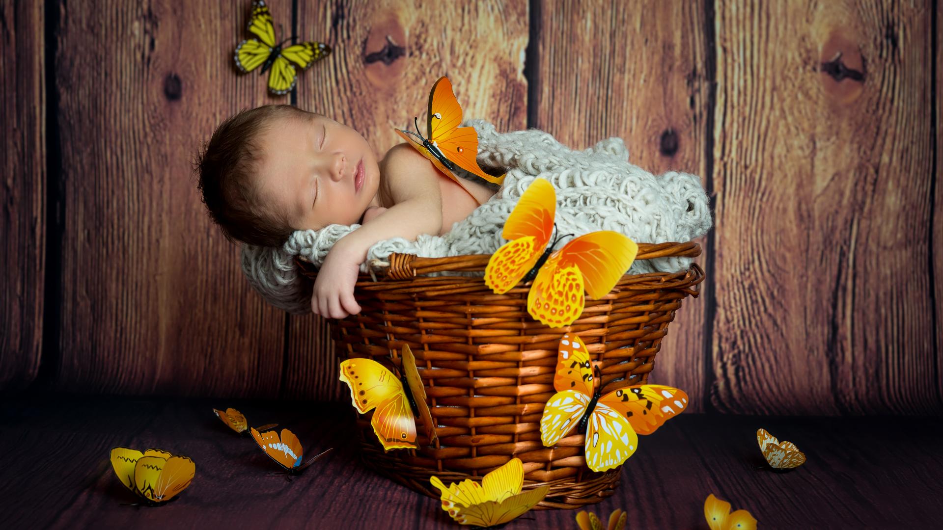 Обои Милый спящий младенец в корзине с бабочками