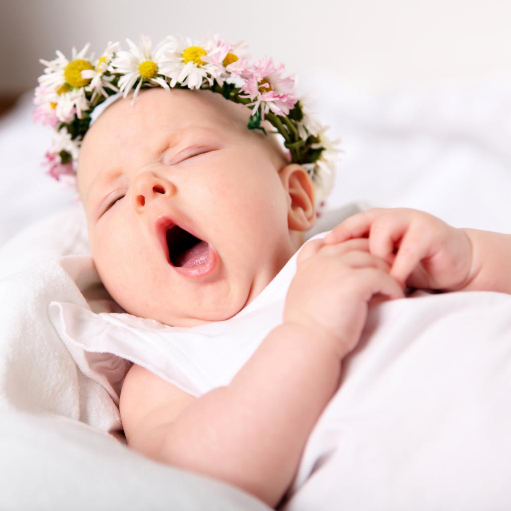 Обои Зевающая маленькая девочка с венком из цветов на голове