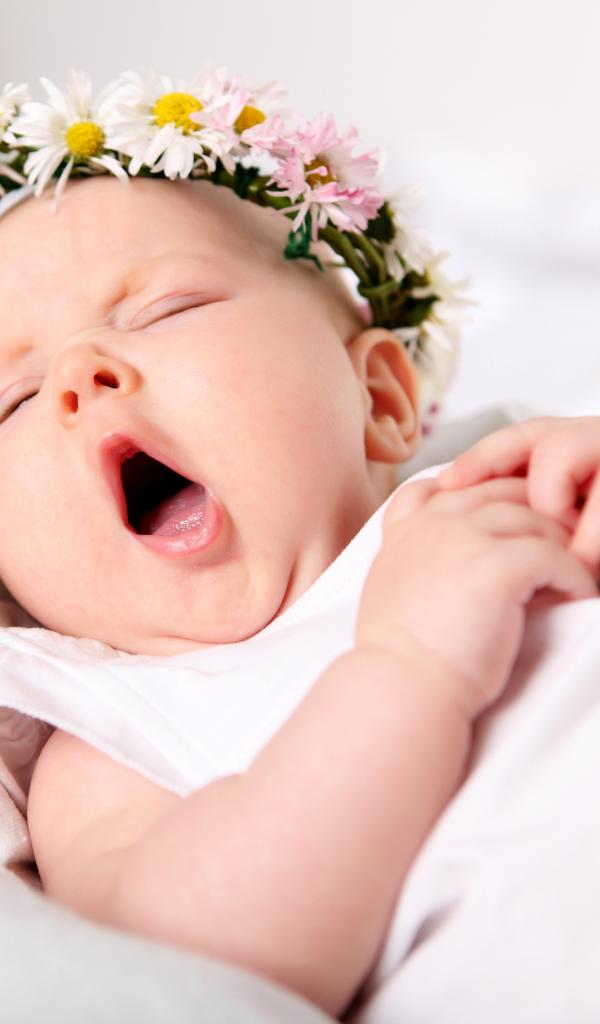 Обои Зевающая маленькая девочка с венком из цветов на голове