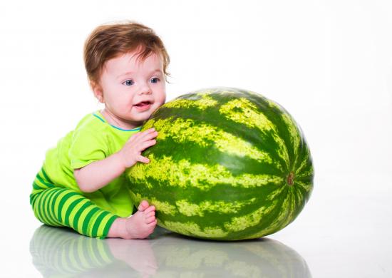 Обои Маленький голубоглазый мальчик с большим зеленым арбузом