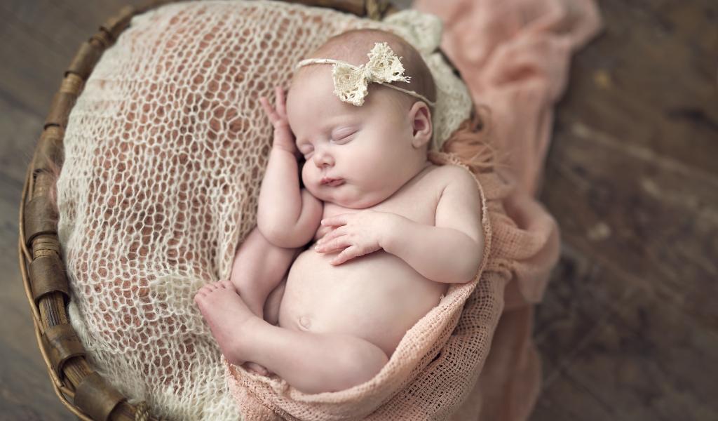 Обои Грудной ребенок с бантиком на голове спит в корзине