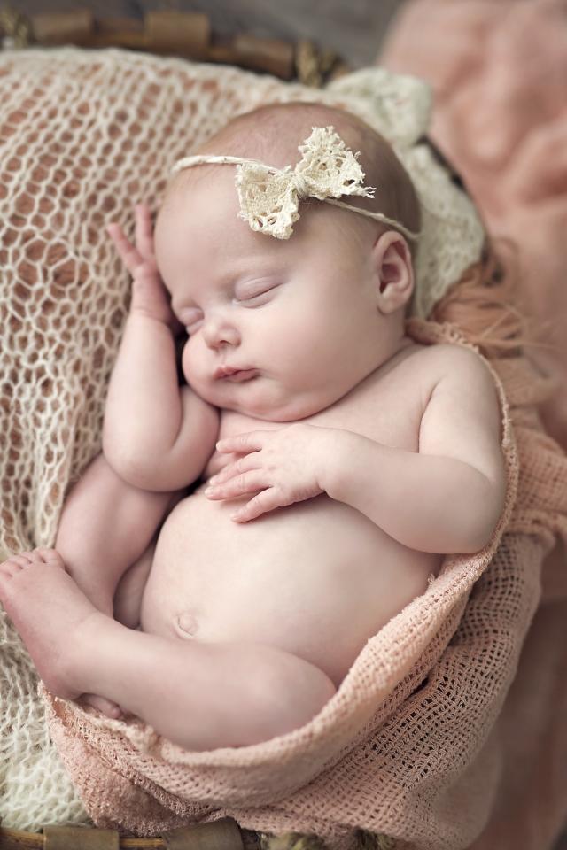 Обои Грудной ребенок с бантиком на голове спит в корзине