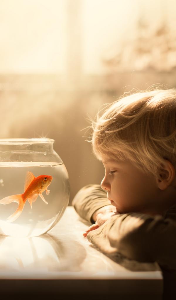 Обои Маленький мальчик смотрит на аквариум с золотой рыбкой