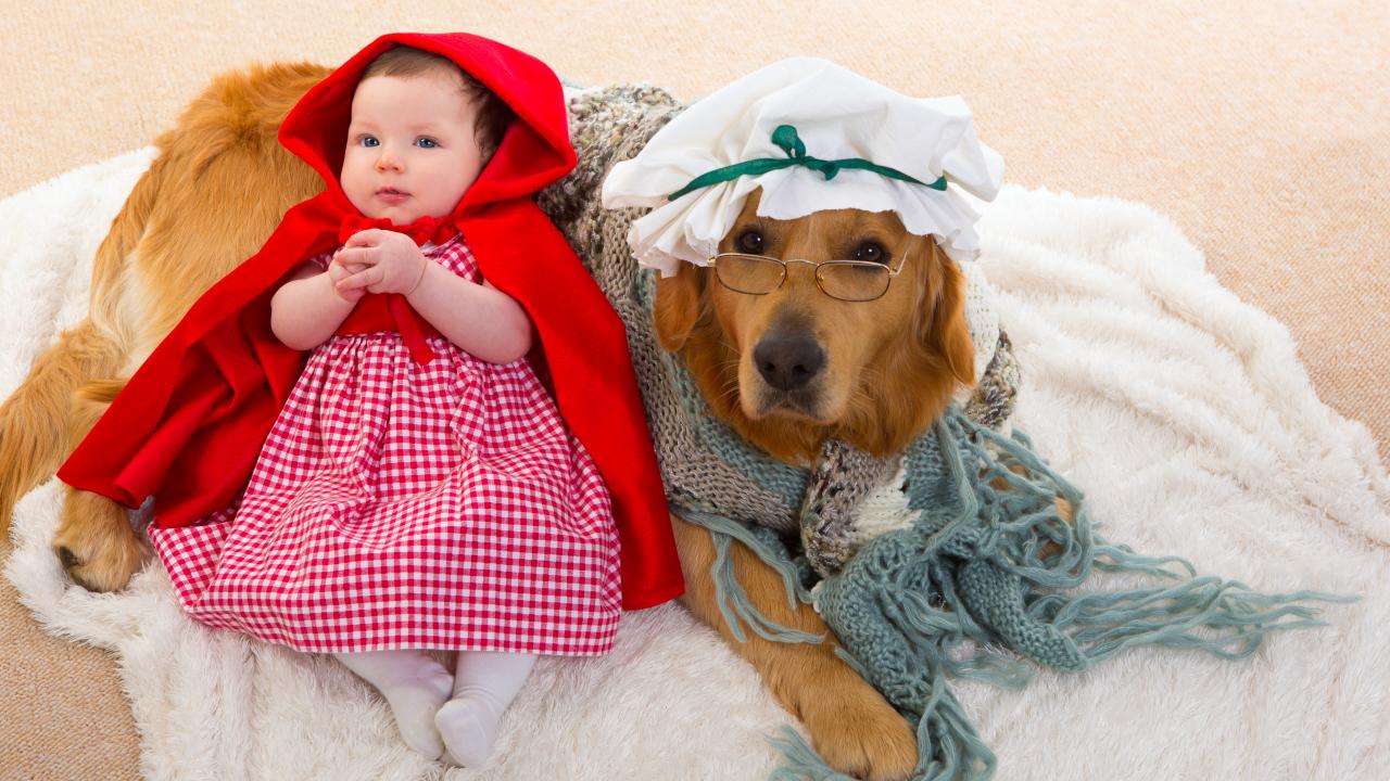 Обои Маленькая девочка в костюме красной шапочки с большой собакой