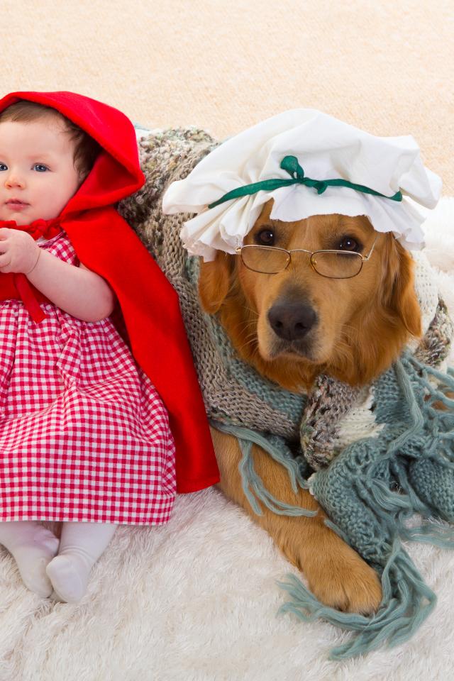 Обои Маленькая девочка в костюме красной шапочки с большой собакой