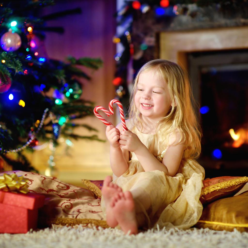 Обои Длинноволосая девочка блондинка с леденцами у новогодней елки