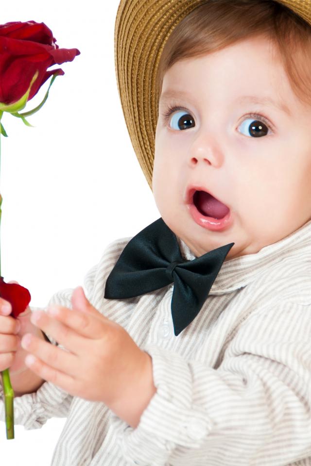 Обои Забавный маленький мальчик в шляпе с красной розой в руке