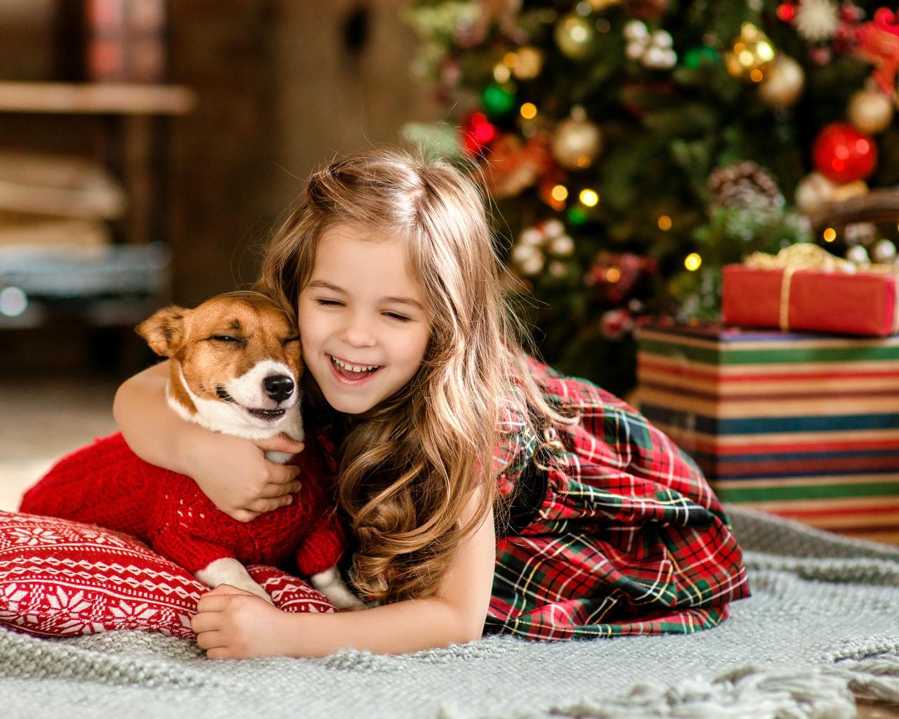 Обои Маленькая девочка с собакой радуются новому году