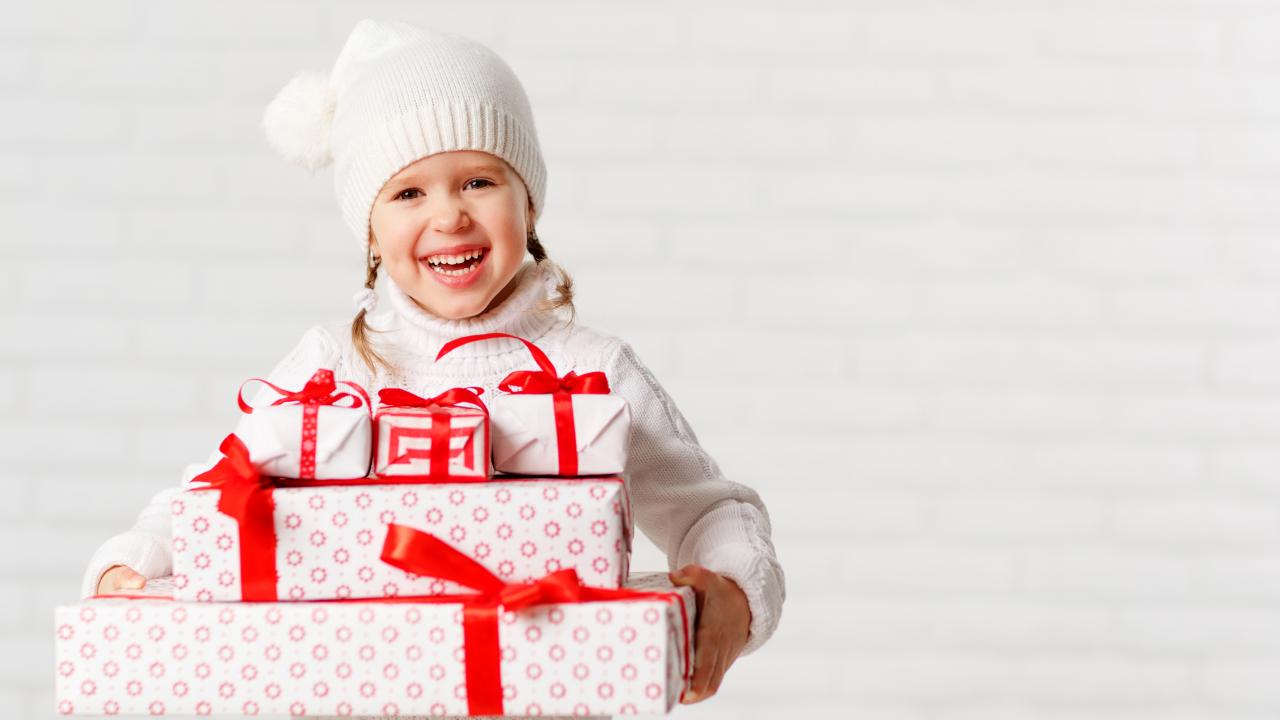 Обои Смеющаяся девочка в белой шапке с новогодними подарками