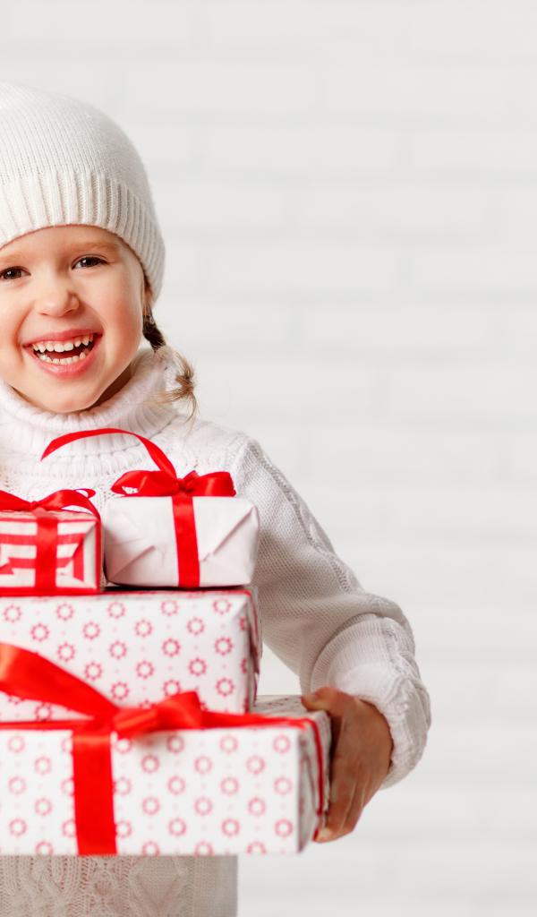 Обои Смеющаяся девочка в белой шапке с новогодними подарками