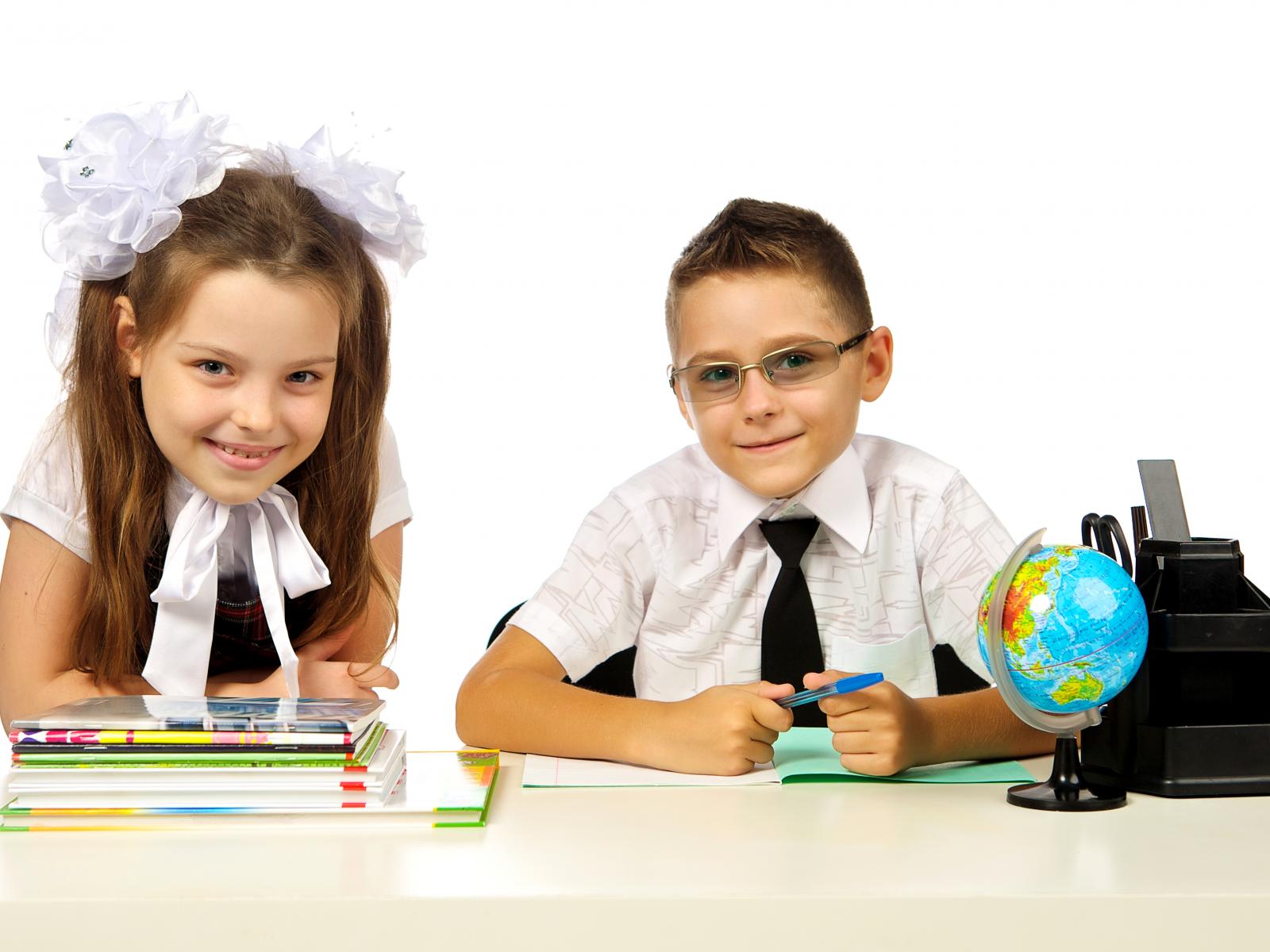 Обои Маленькие мальчик и девочка школьники на белом фоне